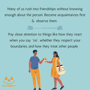 Think of it as a trial period. See how that person reacts to you saying “no” and if they respect your boundaries. Pay attention to whether they ghost you, how they treat other people, or if you always feel like you have to reach out first. If there are too many red flags, then maybe befriending them is a bad idea. This doesn’t mean you have to cut them off. You can continue to be acquaintances if you’d like, just don’t hold them to the same standards you would a friend. And if you don’t have much of a personal relationship, then sharing secrets with them can be a bad idea. Don’t settle with people just because you feel lonely. You want to create quality friendships that will last in the long run and taking your time is key.