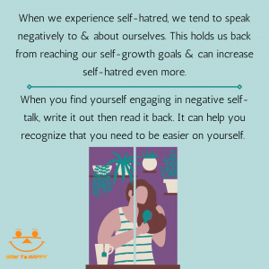 A lot of self-hatred stems from the fact that we are only focused on the negative. We all have flaws, but we all also have amazing qualities. It can be hard to recognize those qualities let alone acknowledge them when dealing with self-loathing.