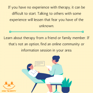 2- Learn about therapy from a friend or family member. If that’s not an option, find an online community or information sessions in your area.